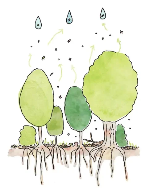 Leaves, branches, and roots interrupt the force of falling rain, preventing erosion and giving water time to soak into the soil rather than rushing away.