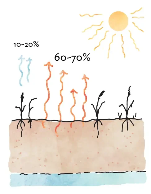 In a drained field, 60-70% percent of the sun’s energy becomes sensible heat – heat you can feel, and only 10-20% is used for evapotranspiration. Adapted from Kravčík et al.