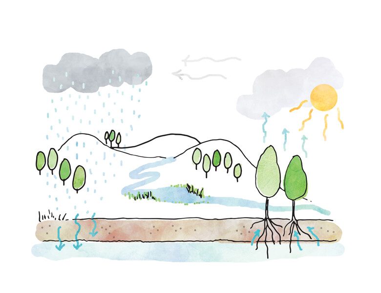 By now, you’ve seen how vegetation plays a key role in the small water cycle — helping water rise from the land into the air, form clouds, and fall again as rain.