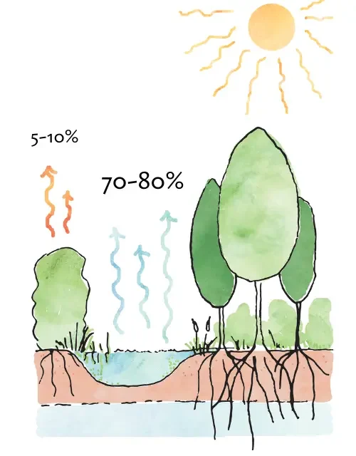 The effect is huge. Studies show that in healthy ecosystems, as much as half of the sun’s incoming energy is used for evaporation and cooling, instead of for direct heating. Without this natural cooling, local climates swing more violently: hotter days, drier air, and greater extremes.